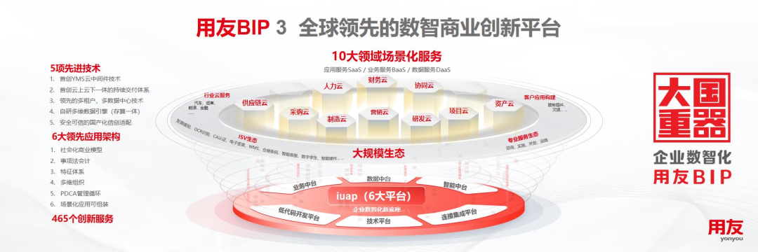 面對(duì)難得的市場(chǎng)和產(chǎn)業(yè)發(fā)展機(jī)遇,用友經(jīng)過(guò)6年的規(guī)模研發(fā)、持續(xù)迭代,以全新理念、全新技術(shù)、全新架構(gòu)、全新模式打造了面向企業(yè)和公共組織數(shù)智化的全新一代產(chǎn)品——用友BIP,并在平臺(tái)技術(shù)、應(yīng)用架構(gòu)、創(chuàng)新服務(wù)等方面實(shí)現(xiàn)多項(xiàng)重大突破與升級(jí),達(dá)到全球水平,包括5項(xiàng)技術(shù)、6大應(yīng)用架構(gòu)、465項(xiàng)創(chuàng)新服務(wù),覆蓋智能財(cái)務(wù)、數(shù)智人力、數(shù)智采購(gòu)、數(shù)智營(yíng)銷(xiāo)、智能制造、數(shù)智供應(yīng)鏈、數(shù)智研發(fā)、數(shù)智項(xiàng)目、數(shù)智資產(chǎn)及協(xié)同工作等十大核心領(lǐng)域,是目前全球領(lǐng)域覆蓋較多的企業(yè)云服務(wù)群。