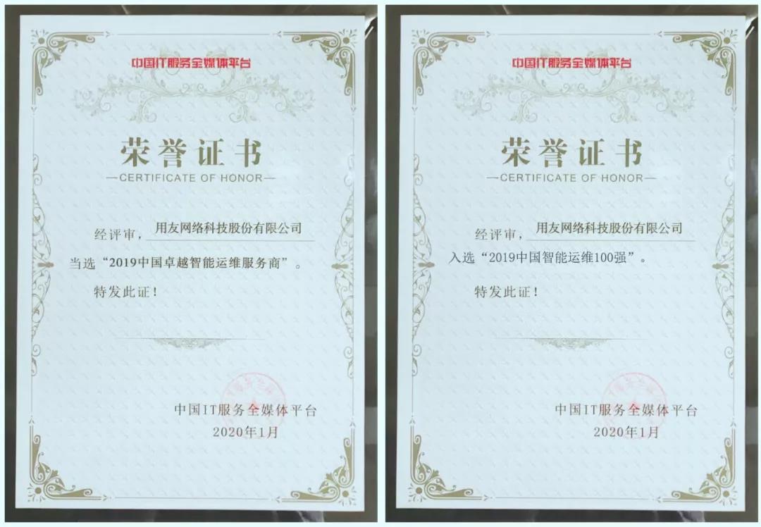 【榮譽】用友喜獲 2019中國IT服務領軍企業(yè)和智能運維服務商兩項大獎